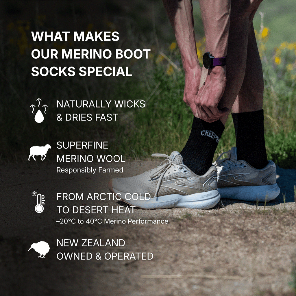 Compared to syntheric fibers, Merino yarn keeps your feet dry, longer, has super-low friction for less blisters, dries out faster and absorbs smell.